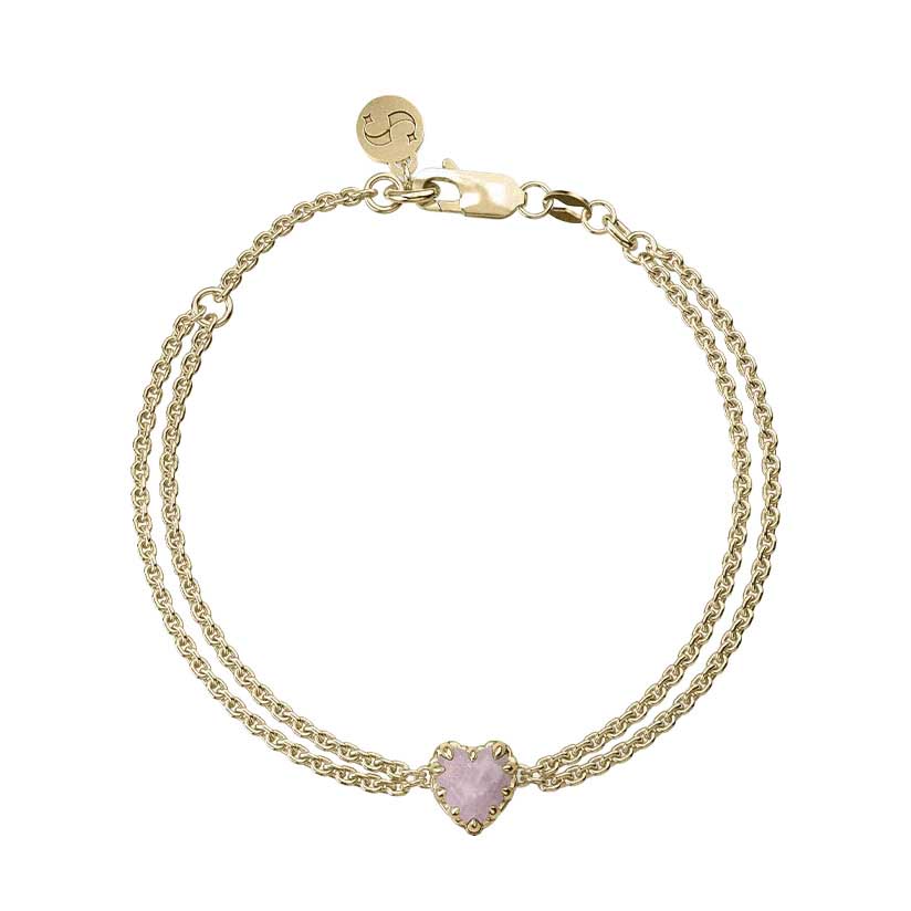 This delicate bracelet features a heart-shaped, checkerboard cut Rose Quartz, suspended between fine chains and secured in a claw setting. Made from a solid sterling silver base and coated in 1.5 microns of lustrous 18k yellow gold.