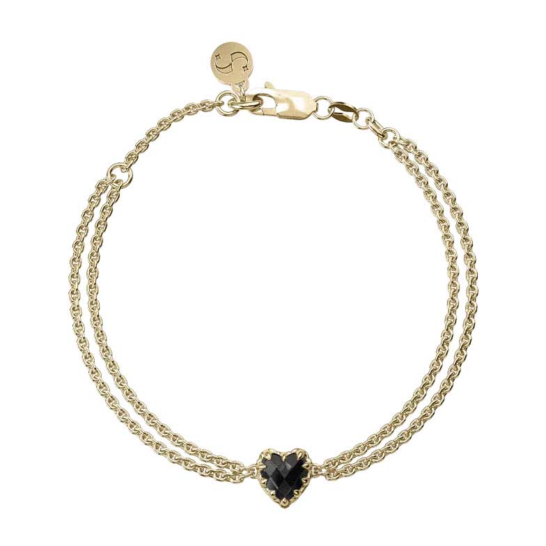 The Love Claw Bracelet is designed to be your special statement piece, evoking timeless elegance. This delicate bracelet features a heart-shaped, checkerboard cut onyx stone, suspended between fine chains and secured in a claw setting. Made from a solid sterling silver base and coated in 1.5 microns of lustrous 18k yellow gold.