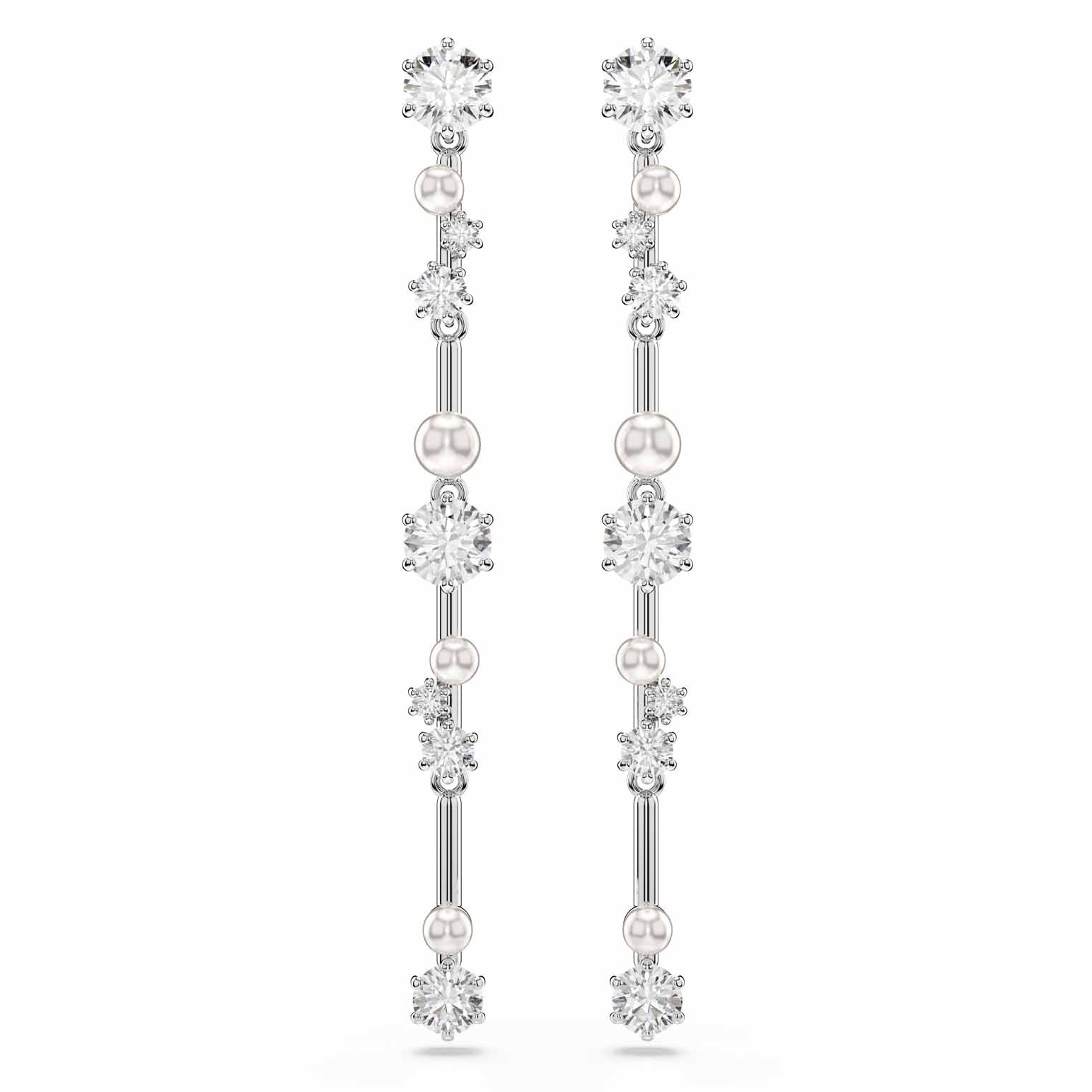 Like trails of stardust, these dangling Constella earrings are filled with magic and light. Each piece is rhodium plated and features a cluster of different-sized Swarovski Zirconia and Swarovski Crystal Pearls, which appear to float among the jewelry’s metallic bars. A sensational addition to any outfit that will enhance your cosmic glow.