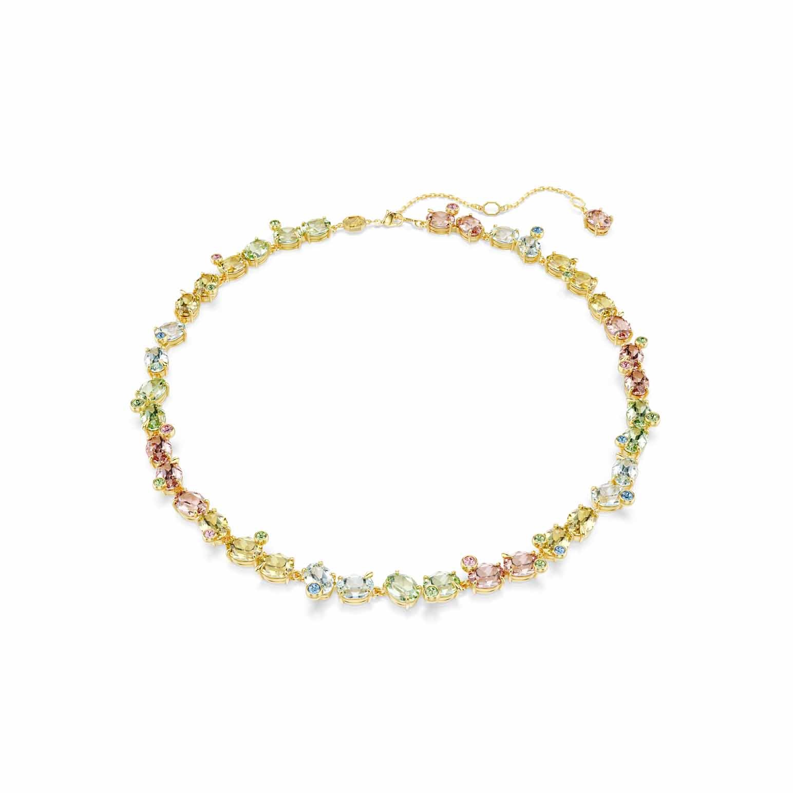 With bold color and shimmering reflections of light, this all-around Gema necklace makes a powerful statement of joy. The gold-tone plated design features a full surround of large crystals in multiple vibrant hues, accompanied by smaller crystals in a playful bubble prong setting. The effect is effervescent as well as energetic, giving you a mood-boosting piece of jewelry for your brightest days.