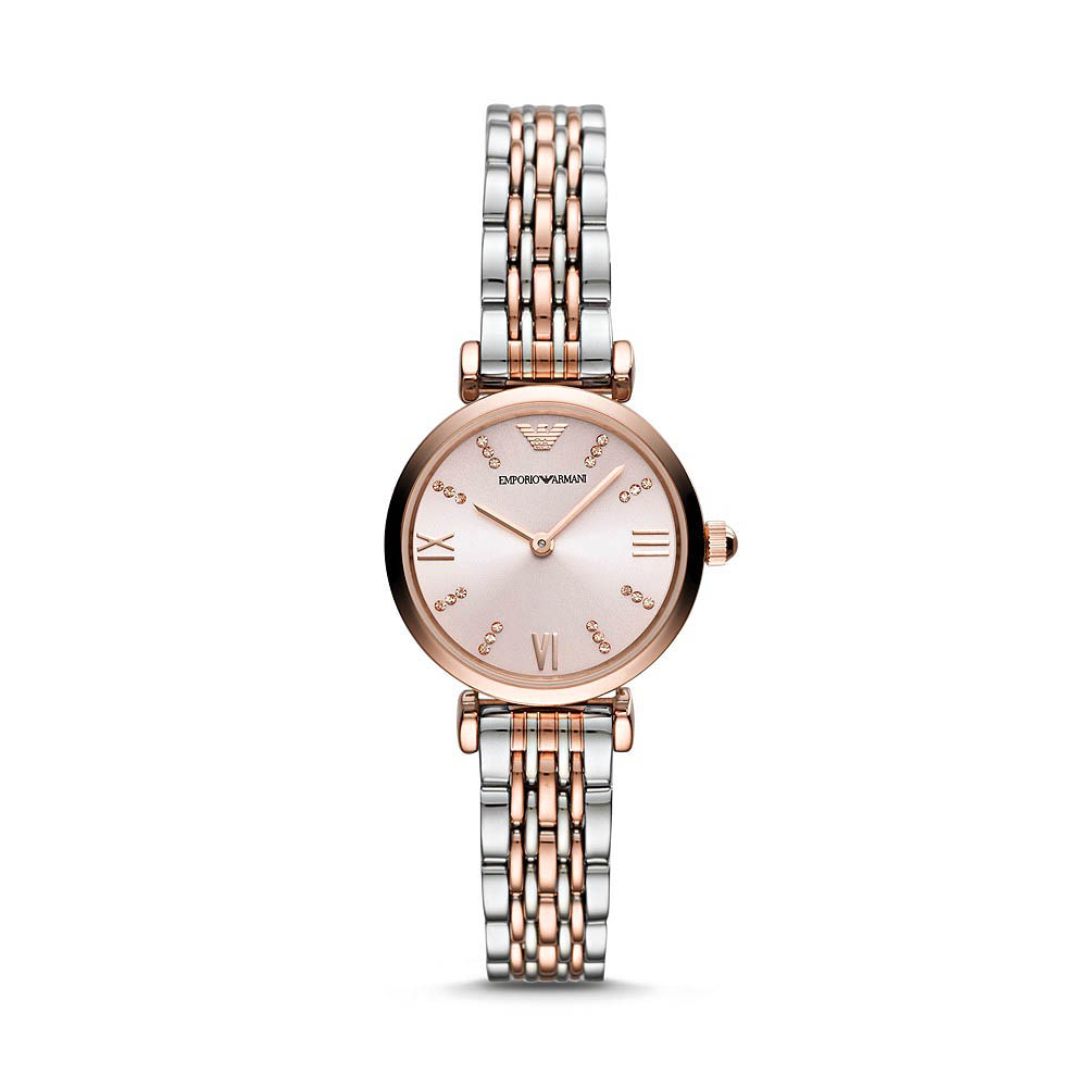 Infuse class to your attire with this women's analog watch. This 28mm watch features a pink sunray dial with rose gold-tone stick indexes, two-hand movement and two-tone stainless steel bracelet.
