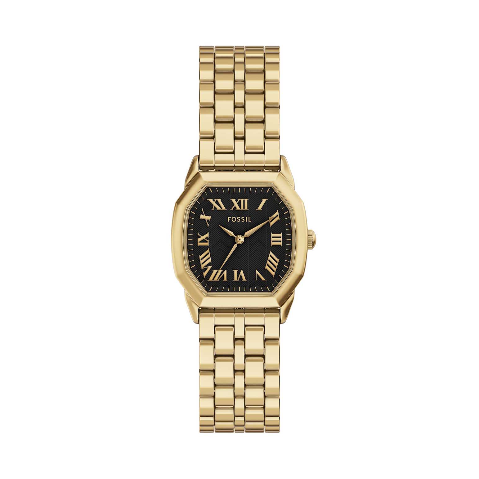 The octagonal gold-tone stainless steel case brings a distinctive geometric design to this watch, complemented by a matching gold-tone stainless steel bracelet. A textured black dial creates subtle contrast and depth, with three-hand functionality for effortless timekeeping. Designed with thoughtful craftsmanship, this piece pairs modern materials with clean lines for a refined yet approachable look.
