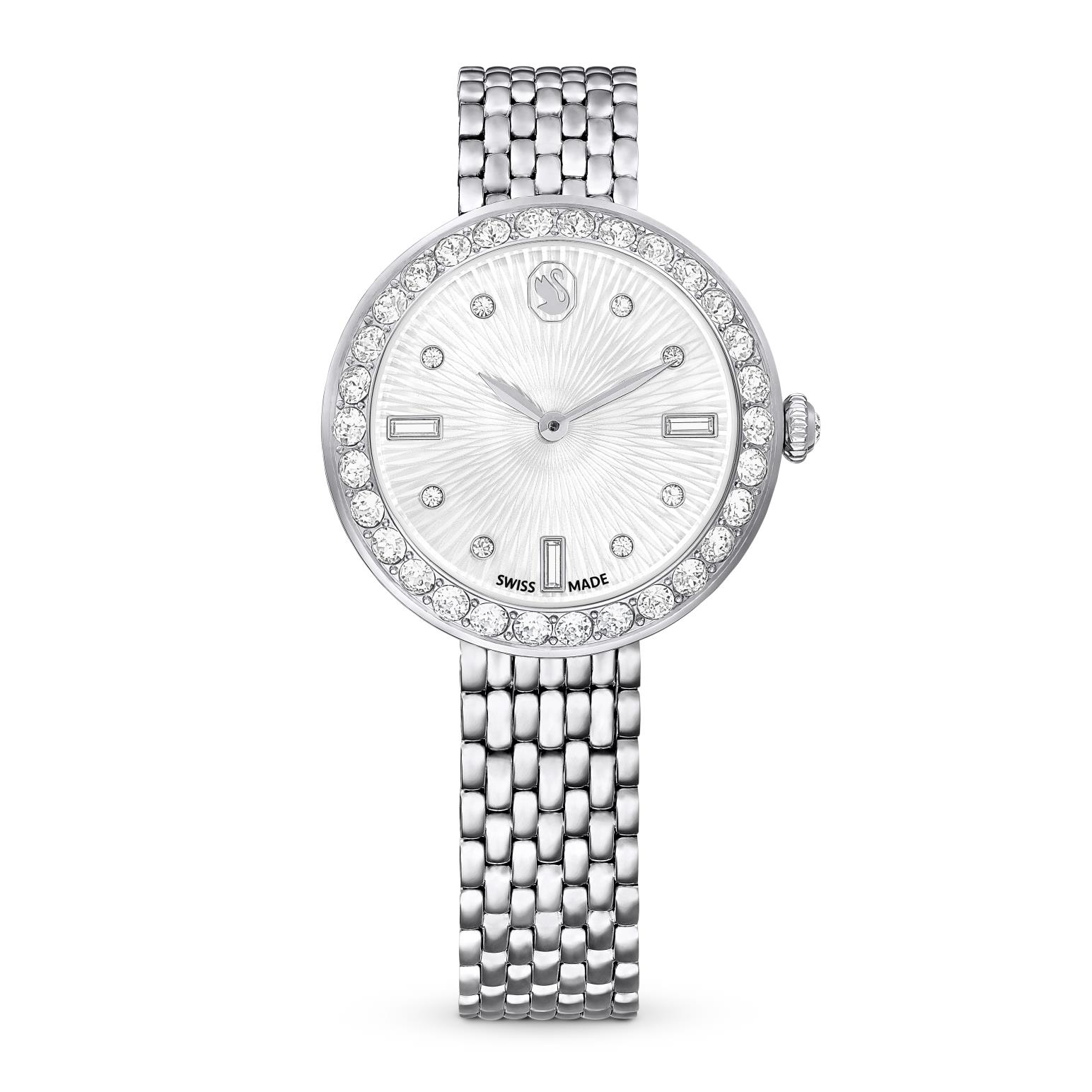 This Certa watch is creatively crafted to accentuate any outfit. The round 30mm case is made in stainless steel and features a bezel set with a pavé of 30 crystals. Beneath the mineral glass, a mesmerizing guilloché dial is revealed, with the Swarovski swan logo at 12 o’clock, along with indexes created from round and baguette crystals. There is also a single crystal set in the watch’s crown. For style around the wrist, the watch is presented on a seven-link bracelet in stainless steel. This Swiss made watch is water resistant to 50m and is designed to keep you on time for everyday occasions with exquisite sophistication.