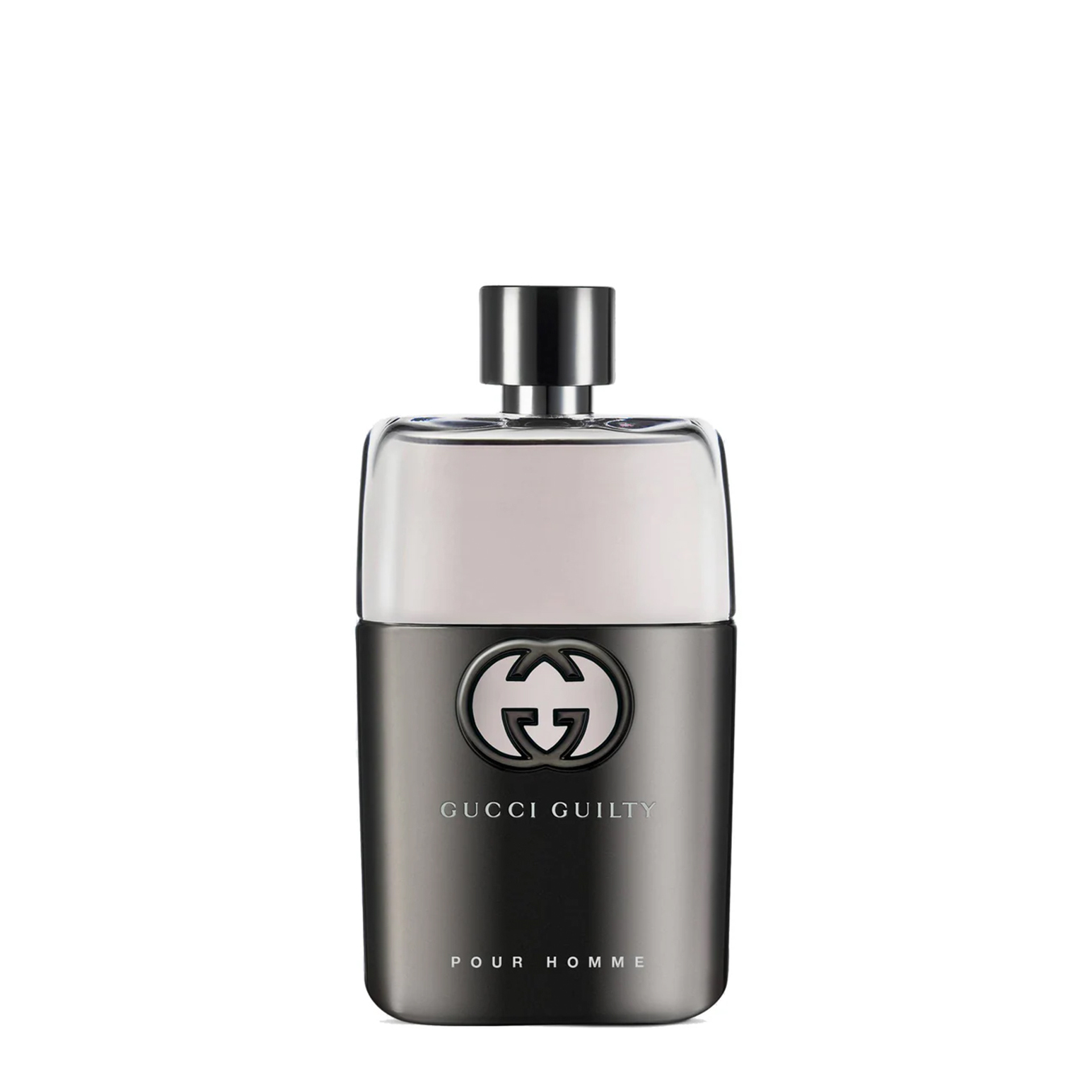Gucci Guilty Pour Homme’s grey clad bottle and cap complement the warm purple-grey colored scent. The Interlocking G logo defines the front.
