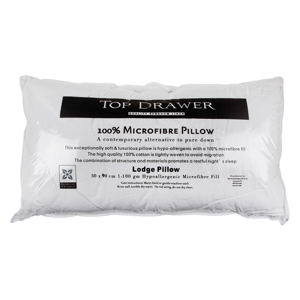 Top Drawer Microfibre Pillows have 100% hypoallergenic microfibre fill encased in a tightly woven 100% cotton outer. Microfibre is soft yet retains its shape longer than most other pillow fills.