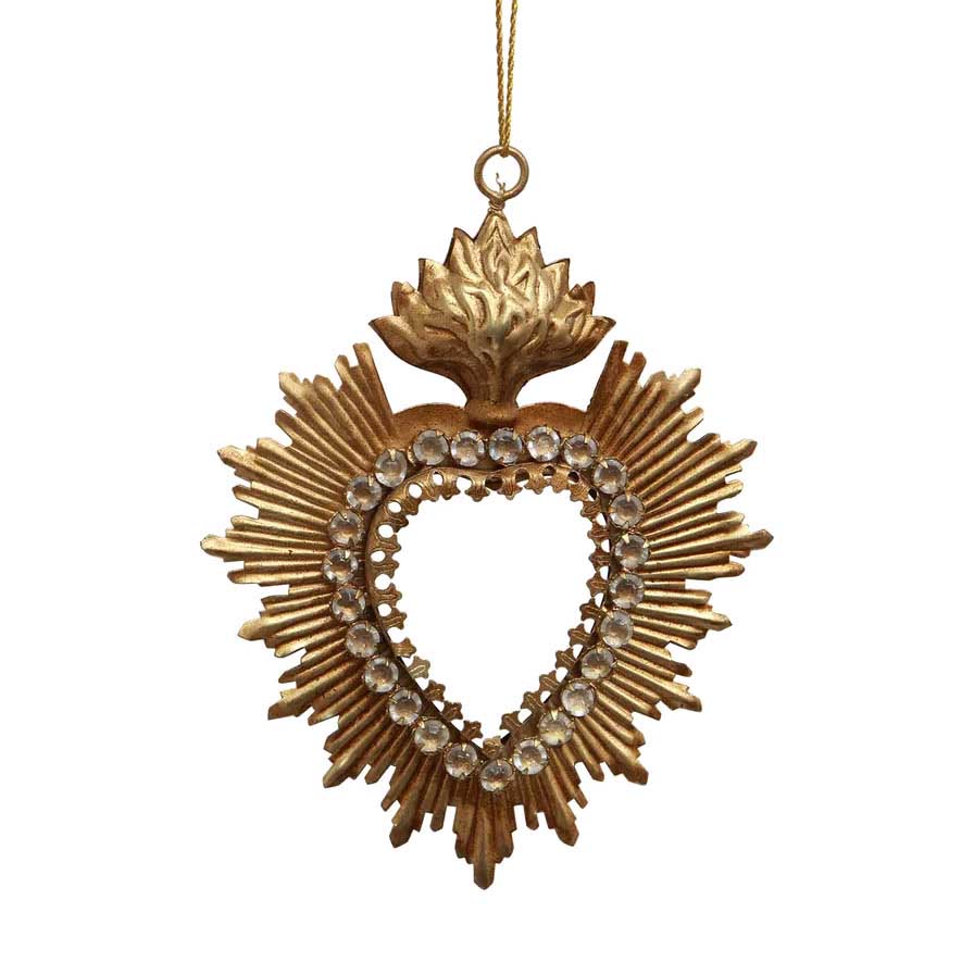 The Hanging Jewelled Heart with Stone is a delicate yet striking hanging tree decoration, finished in aged gold with a jewelled white heart. This versatile piece effortlessly complements any Christmas theme, adding a touch of elegance to your tree.