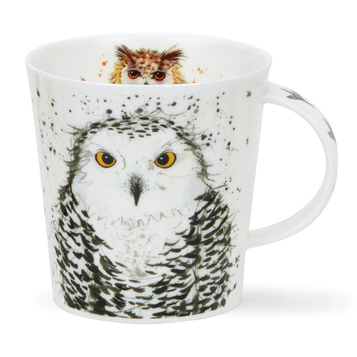 Dunoon fine bone china mugs are handcrafted in Staffordshire, England. They are produced to the highest quality using traditional methods which have been developed and refined over 3 family generations in the pottery industry. With its straight edges and clean lines, Cairngorm is a contemporary mug shape holding 0.48L. It is a larger version of our Lomond shape, and Cairngorm can make an excellent gift for anyone. With a portrait of a Snowy Owl on the front and an Eagle Owl on the back, this charming design has been painted in watercolour with soft black and brown splatter in the background.