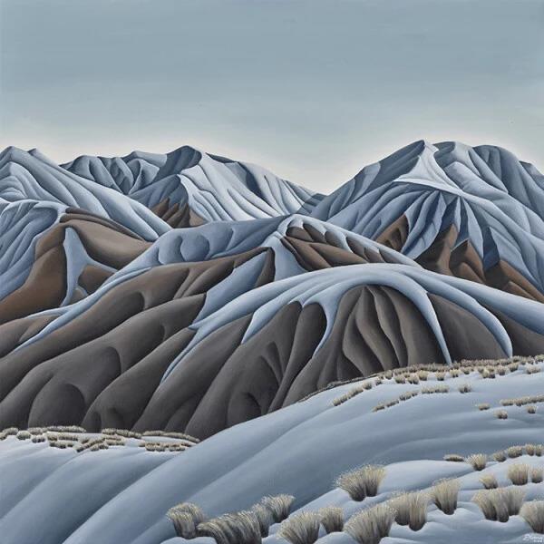 Inspired by the rugged beauty of New Zealand, her paintings bare the landscape down to its most simple form to reveal the essence of the land beneath.