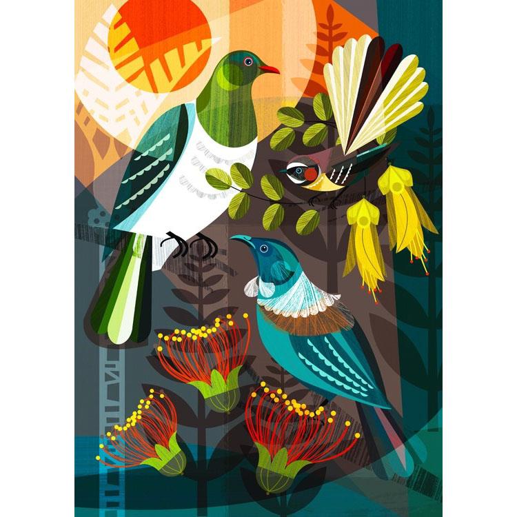 Ellen Giggenbach was born in Bavaria, Germany. She now lives in the seaside village of Eastbourne in New Zealand with her husband and two young boys. After studying Graphic Art in Vienna for 2 years, she went on to receive a New Zealand Diploma with Distinction in Design. Her art works are inspired by traditional European folk art, her unique natural environment and love of the distinctive colours and forms of mid century illustration and design. Each piece starts its life as an idea only. Piece by piece it grows like a puzzle till even one more element would upset a carefully crafted balance of shape and colour. Ellen’s art works are unashamedly decorative, designed to be pleasing to the eye. Vibrant yet sophisticated, intuitive yet precise.