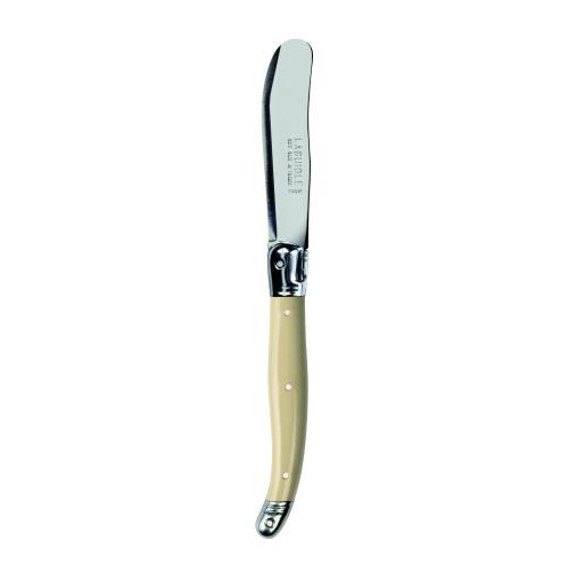 Perfect for spreading butter, soft cheese or pate. Made with resin handle and stainless steel blade. Crafted by hand in Laguiole, France. Every Andre Verdier item features the trademark Laguiole Bee on the handle. Full Tang Construction. Dishwasher Safe.