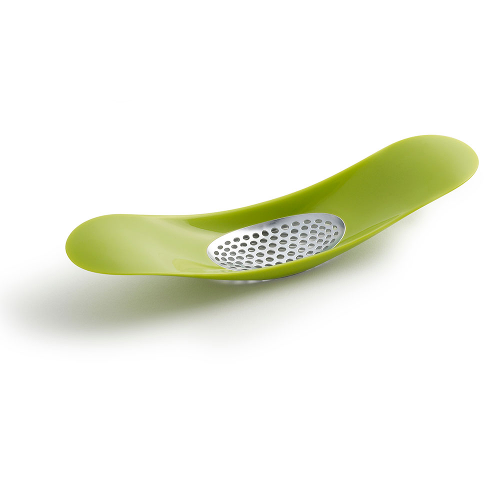 By using downward pressure and a 'rocking' motion, this stylish tool breaks up garlic cloves quickly and easily, forcing the pieces up through the array of small holes in its base. The crushed pieces are then held in the curved design, allowing them to be spooned or scraped conveniently into a pan or bowl. Additional cloves can also be crushed at this stage before emptying. Rocker is easy to clean under running water but is also dishwasher safe. Green. By Joseph Joseph, masters of form and function.