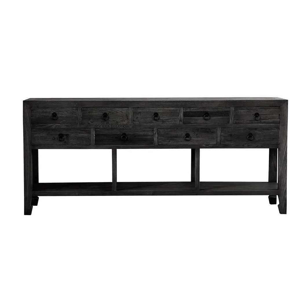 A striking sideboard that will elevate your home for years to come. Crafted from solid oak wood, and painted in a sandblasted ebony colour. This sturdy sideboard features nine drawers and a bottom shelf, offering ample storage to keep your space organized and clutter-free.