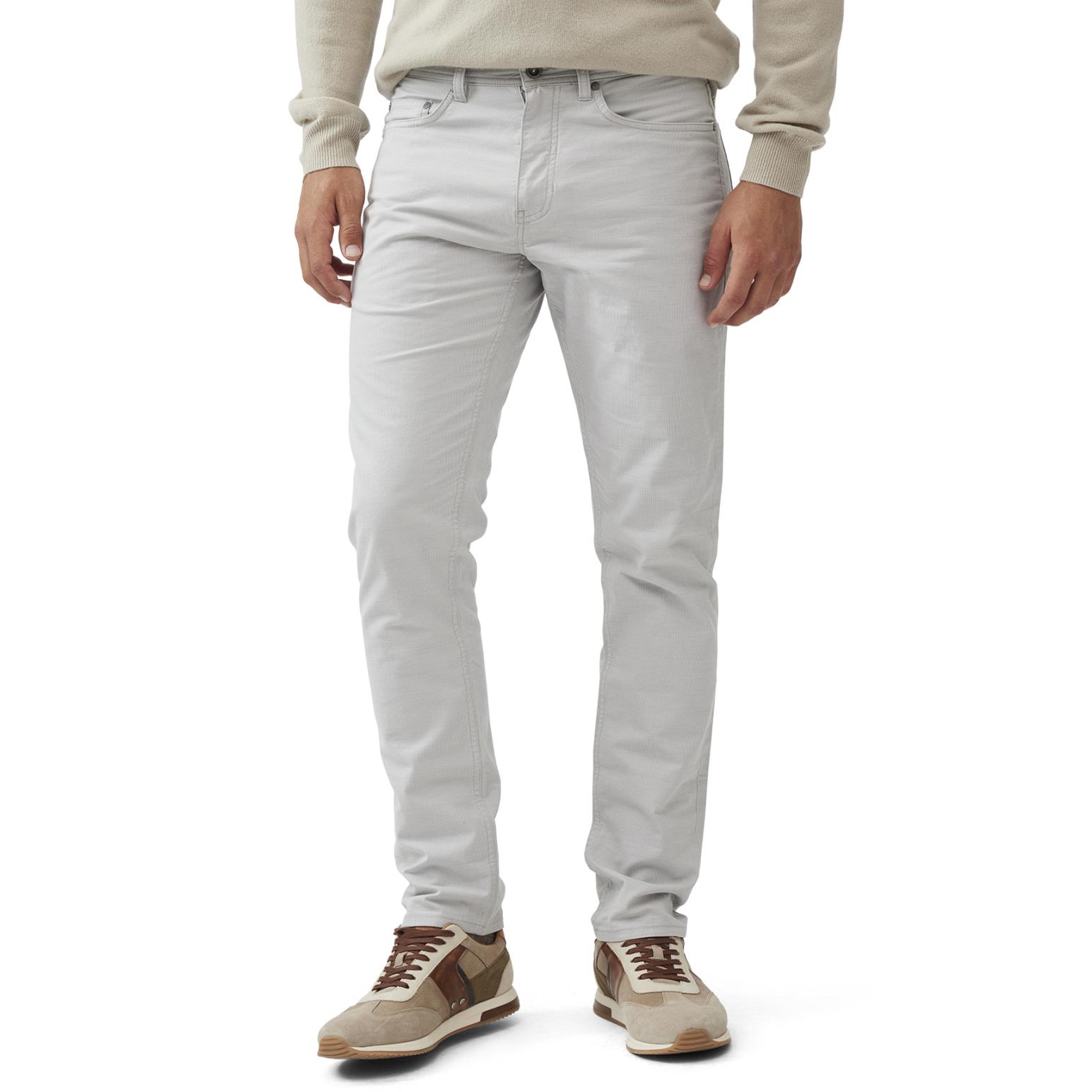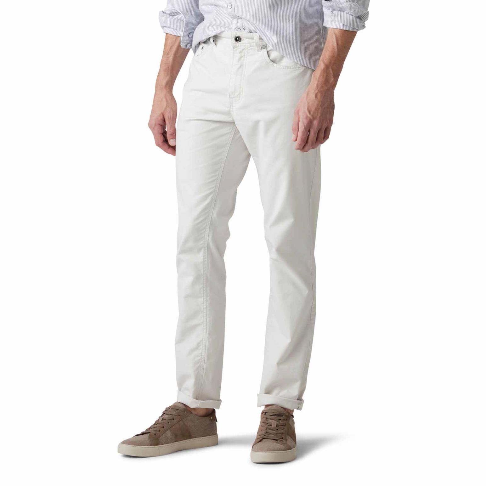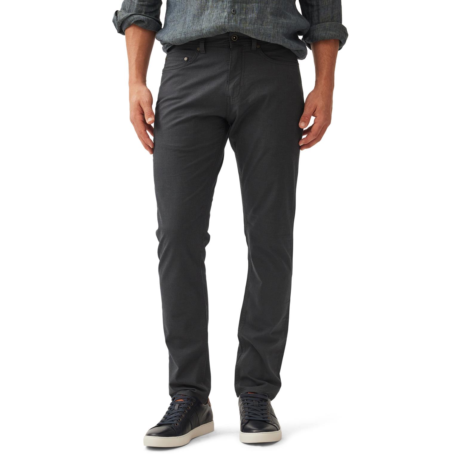 Dressier than denim jeans, this fabric version features a sophisticated micro-textured cotton, enriched with a little stretch for comfort. Cut in a flattering mid-rise and straight leg, these versatile jeans are simplistic yet smart, and broken in with a heavy garment wash.