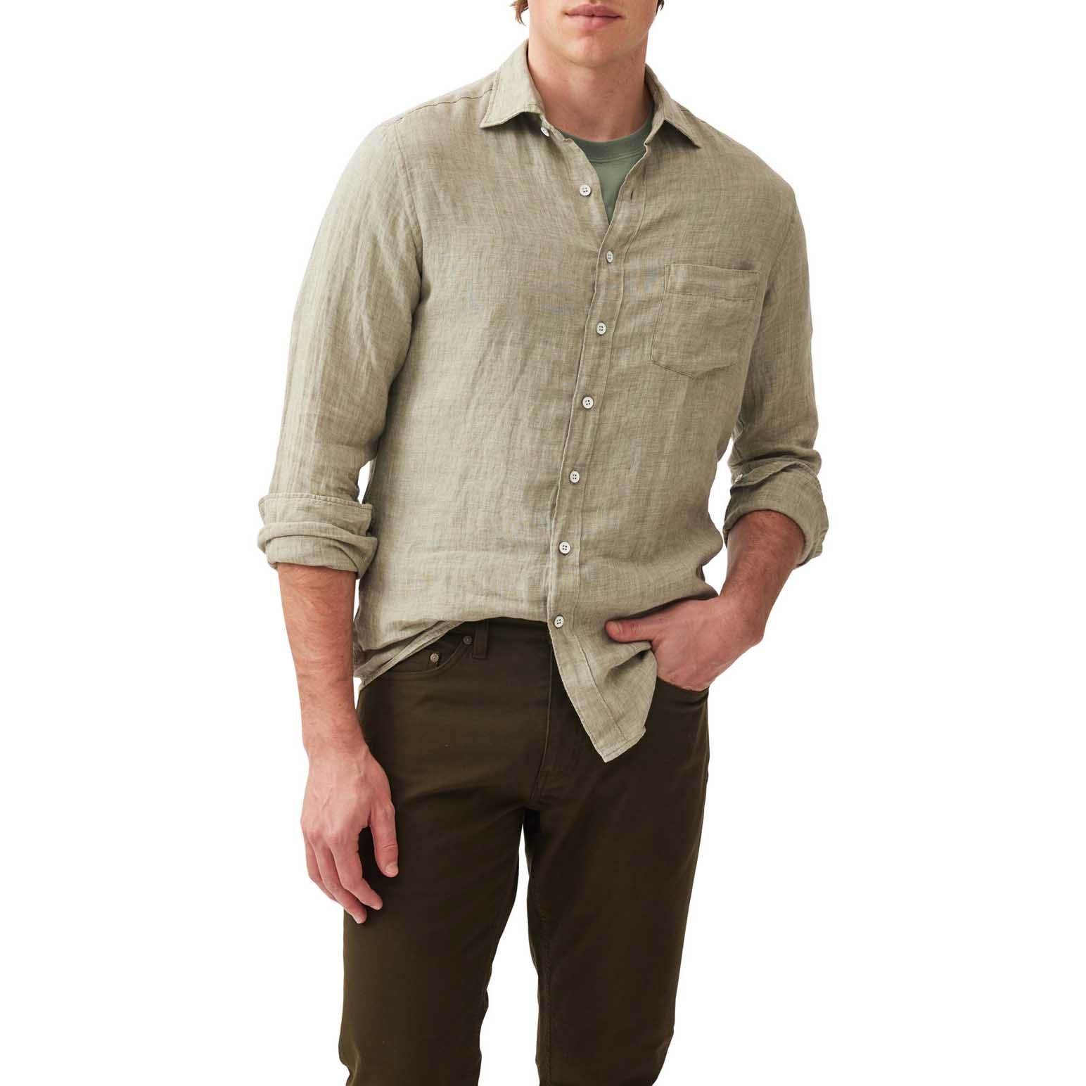 This shirt is woven from yarns that feature a unique delave wash, which lends the fabric a slightly faded look and soft feel. Milled in Italy, from premium linen harvested in France and Belgium and certified by European Flax. Pre-washed for easy going feel, the fabric will continue to soften over time and with each and every wash.