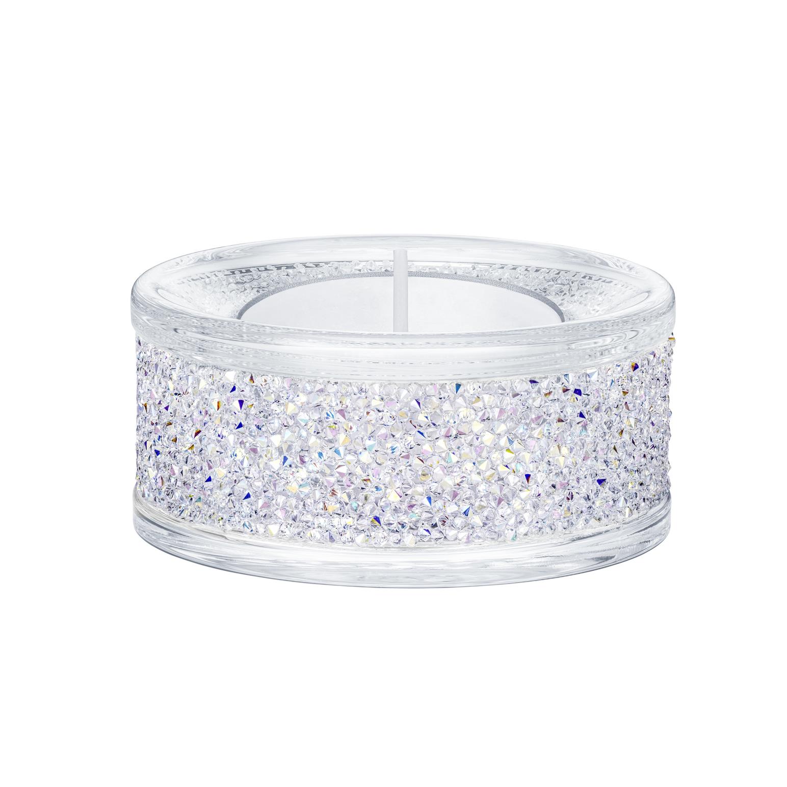 Embellished with over 1,500 Swarovski crystals set in the Crystal Rocks technique, this contemporary glass tea light holder shines brightly in our signature Aurora Borealis effect. Certain to add sparkle to any room; it will create a glamorous atmosphere, day and night. A perfect gift for a loved one. Decoration object. Not a toy. Not suitable for children under 15. Candle not included.