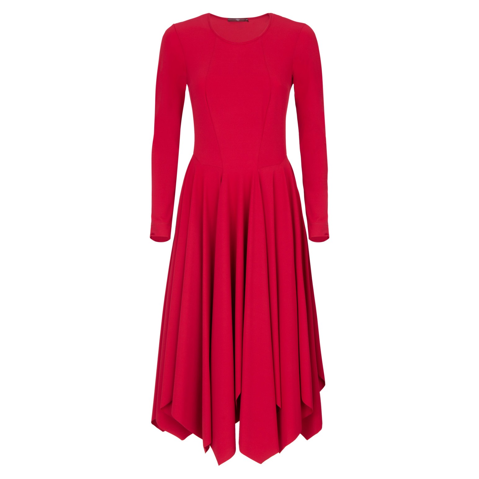 Wide disc neckline. Fitted bodice. Long sleeves with straight cuffs. Flared skirt with side seam pockets and multi-panel construction that ends in points. Asymmetric raw hem.