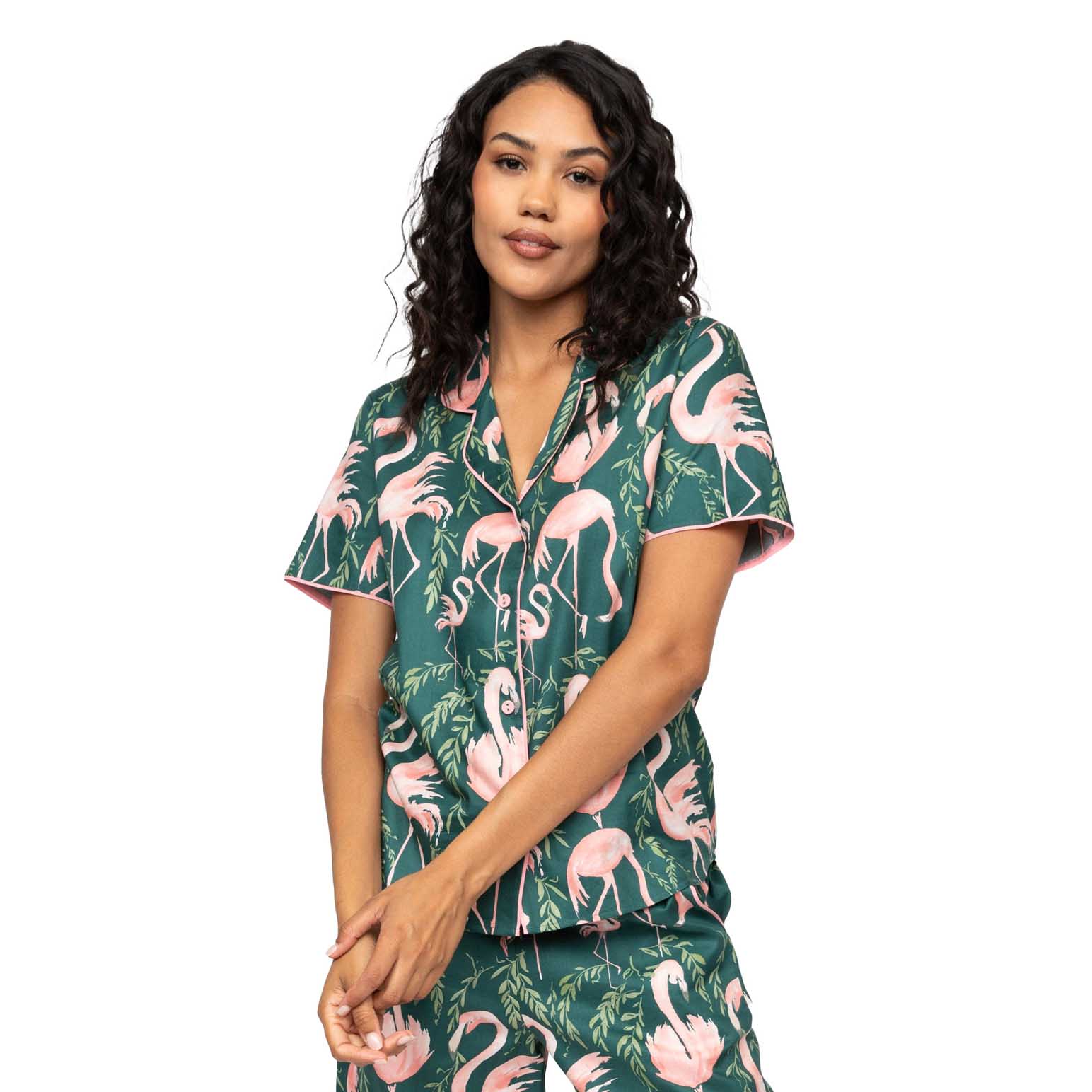 Bring a tropical splash of fun to your evening relaxation with the Ivy Womens Emerald Green Mix Flamingo Print Short Sleeve Pyjama Top. Made from a fabric blend of 60% cotton and 40% modal, this pyjama top is certain to make you feel comfortable and relaxed as you unwind in the evenings. Plus, as it’s printed with a pattern of pink flamingos against a green canvas, when you’re wearing this pyjama top, you’ll be painting a picture of playful style no matter the time of day. A revere collar, short sleeves, and a shaped bottom hem create a sleek silhouette that combines with a peach modal trim and modal-covered buttons for a playful piece that’s full of luxury details. This pyjama top is also available as a part of a set with our Ivy Womens Emerald Green Mix Flamingo Print Wide Leg Cropped Pyjama Bottoms allowing you to make a fully coordinated look. Whether you’re rocking a full set or wearing this with other pieces from your nighttime wardrobe, this top is sure to be a new favourite in your nighttime wardrobe.
