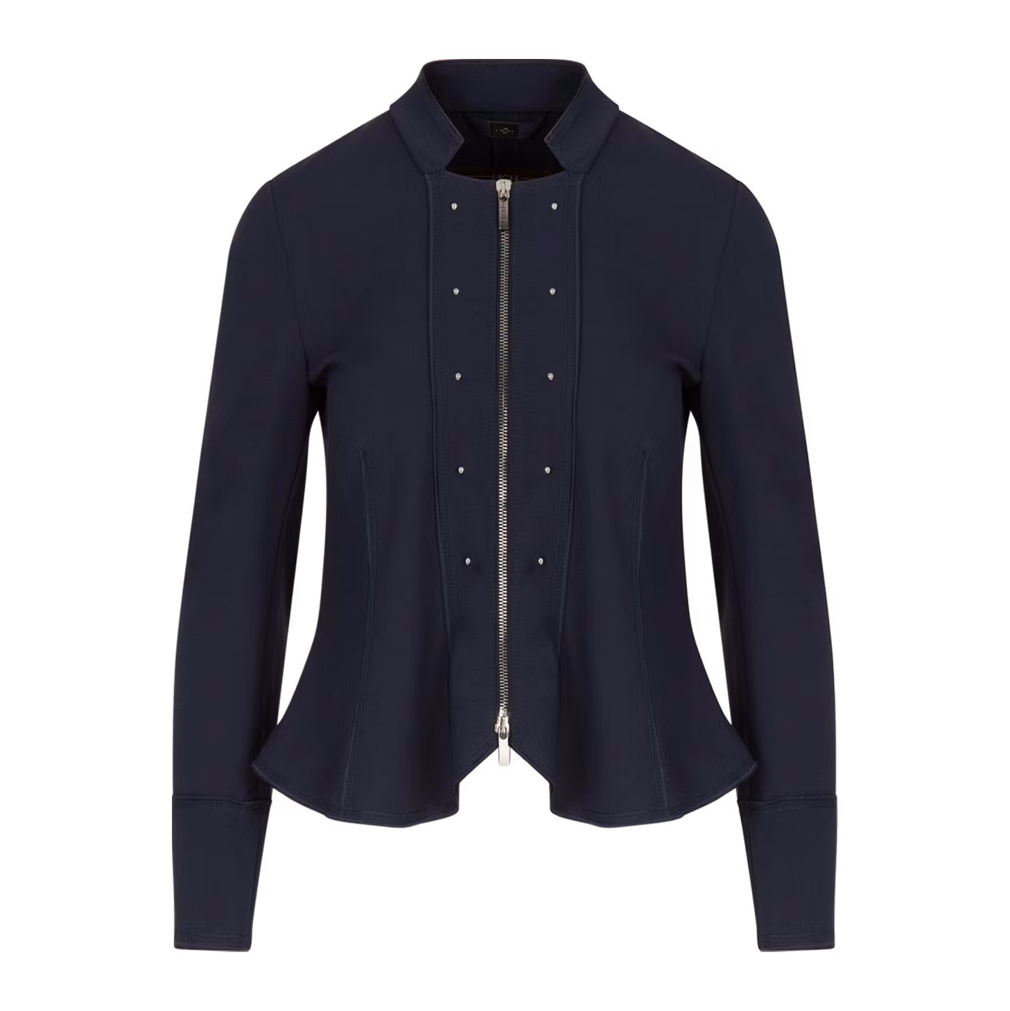 Cardigan-jacket in navy compact Punto Milano double jersey. Overstitched notched stand collar on a front fastened with a two-way silver metal zip. Facings inverted, overstitched and decorated with silver metal mini studs. Fit is created with diagonal darts from the waist. Natural shoulders over inset sleeves which finish in over stitched cuffs with grosgrain tape. Reverse has overstitched seam and curved fit seams to a fluted hem edged in grosgrain ribbon.