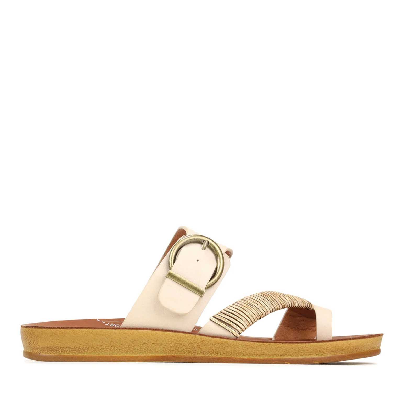 Los Cabos captures the spirit of fun in the sun with their Bria sandal. The ease of a slip-on is given a touch of natural beauty with our woven bamboo wrap gracing the toe strap, whilst the antique round buckle on the back strap adds a treasure box accent. Ideal for resort escapes, beach walks or just a shoe to slip on when you need to rush out the house.