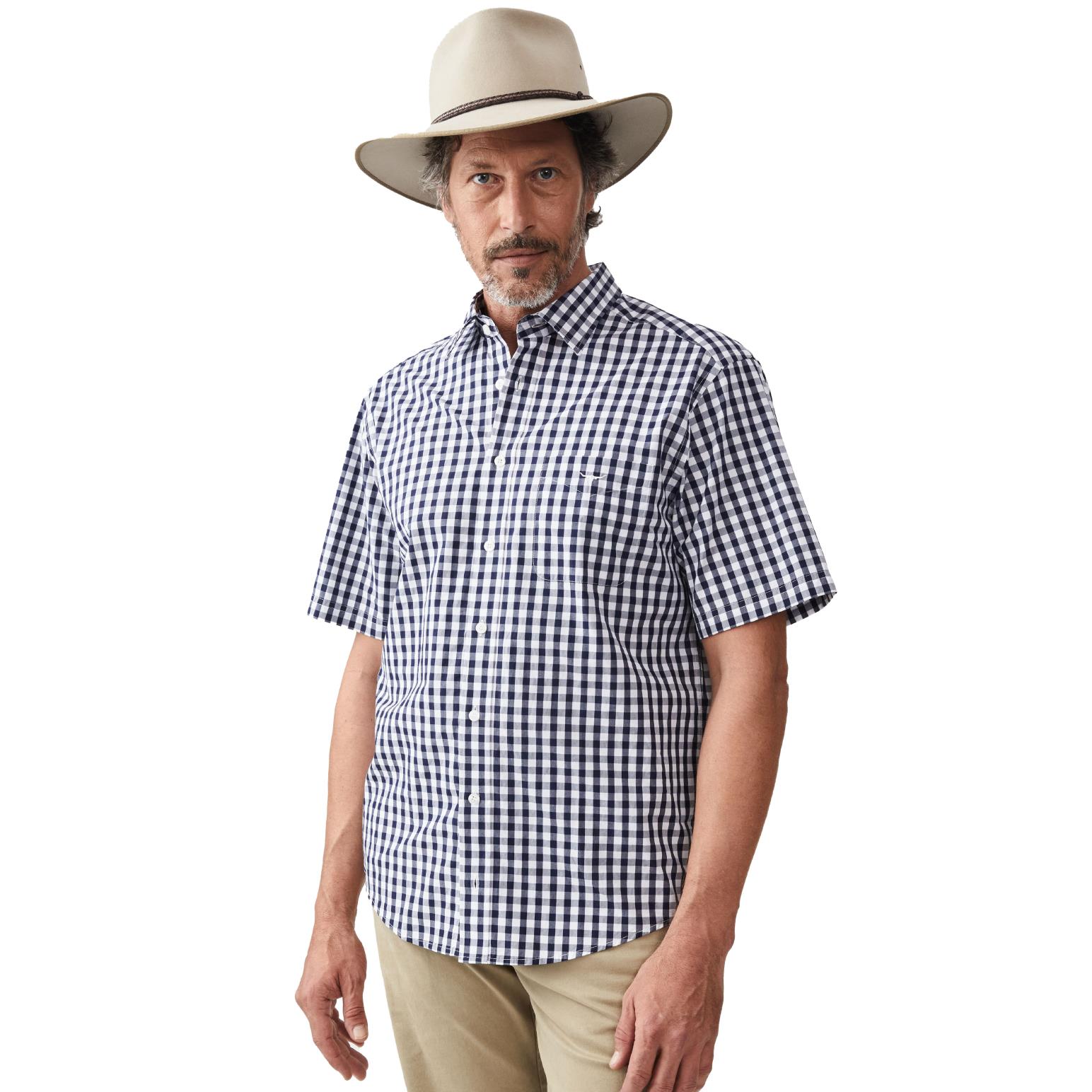 Constructed in a small check on a twill base, the Hervey shirt is a short sleeve casual shirt featuring a single pocket, RMW logo buttons and signature Longhorn embroidery on the pocket, side back tucks along the yoke for added movement.