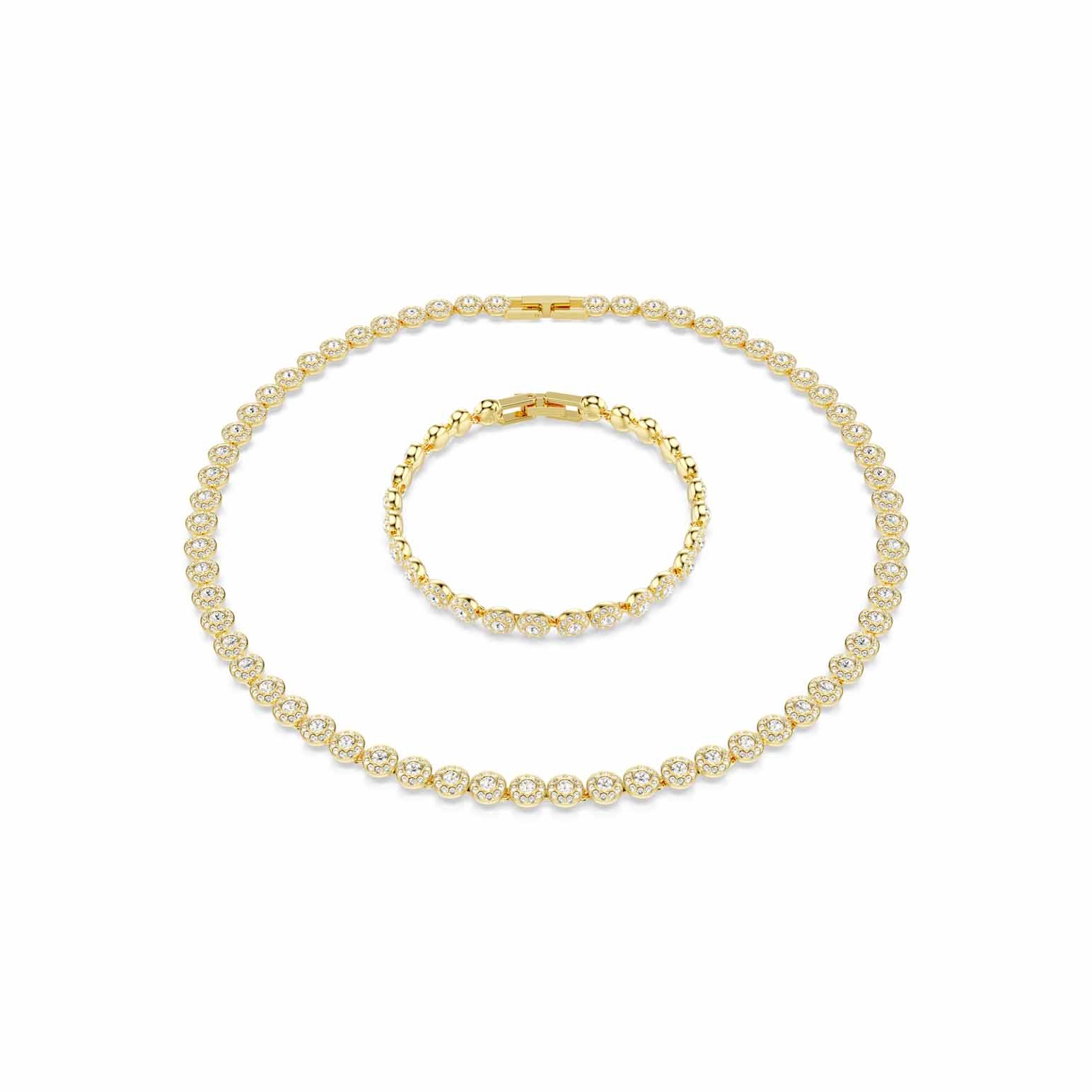 Harmonizing luxury throughout your style, this gold-tone plated set was born to shine. Each piece features a full surround of round-cut crystals, each framed by a halo of clear pavé. This includes the dainty motifs on both the necklace and the bracelet. The foldover clasps deliver a seamless closure, while the additional extenders mean you can adjust the jewelry for both comfort and size. Wear these pieces together whenever you need a look of all-over glamour.