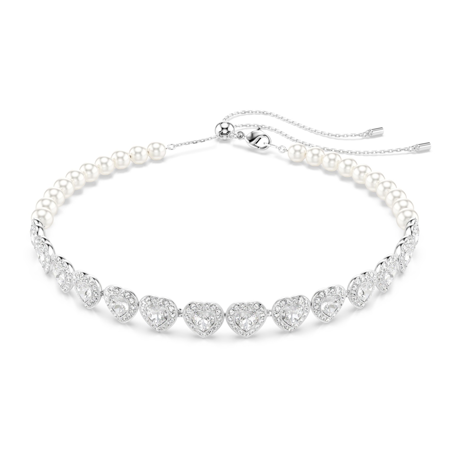 This radiant choker was made for an intense expression of love. The rhodium plated design is partly decorated with luxurious Swarovski Crystal Pearls, while at the front, there is a row of heart-shaped crystals, each surrounded by a glittering halo of clear pavé. A sliding closure at the back means you can adjust the jewelry to your perfect fit. Pair this bold necklace with other matching jewelry to create your own romantic combinations.