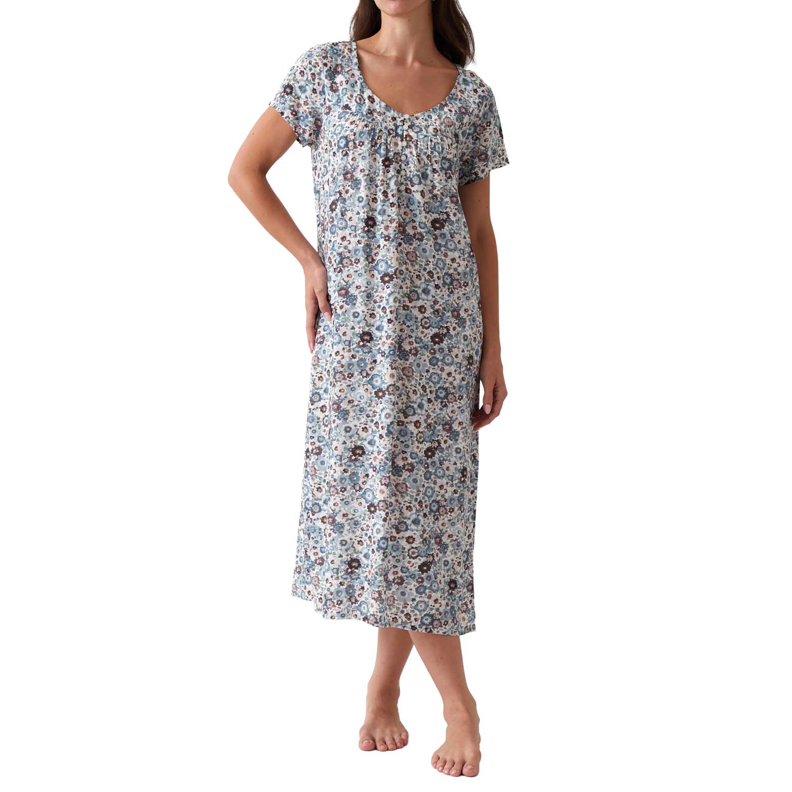 Made from modal. Nightie is a regular fit with a longer length hemline, adjustable straps and soft back elastic, a V-neckline with gentle bust gathers and a curved hem. Size medium garment measurement: Bust circumference is 94cm, hip circumference is 120cm lower front strap point to hem length is 113cm. Designed with love in NZ and made exclusively for Wallace Cotton. Please follow instructions on care label for laundering. We recommend laundering our sleepwear items in a delicates bag.