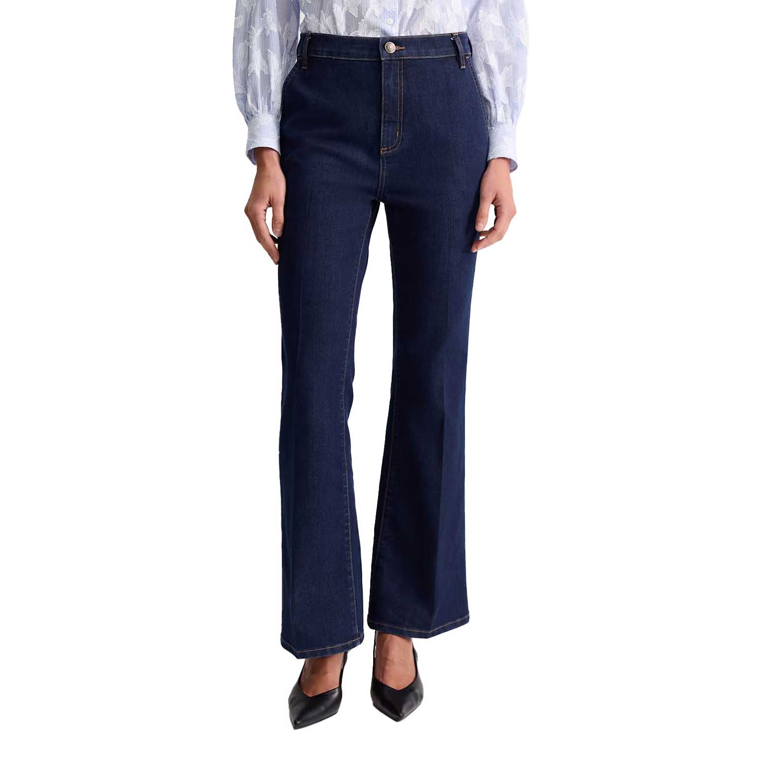 The Maxine Trouser Jean features a stretch fabrication to offer you all day comfort. These high waisted jeans have a wide leg design, a full length hemline, a centre front fly with a metal shank closure, contrast topstitching and a relaxed fit. Wear these jeans with a knitted vest as a top for a modern finish.