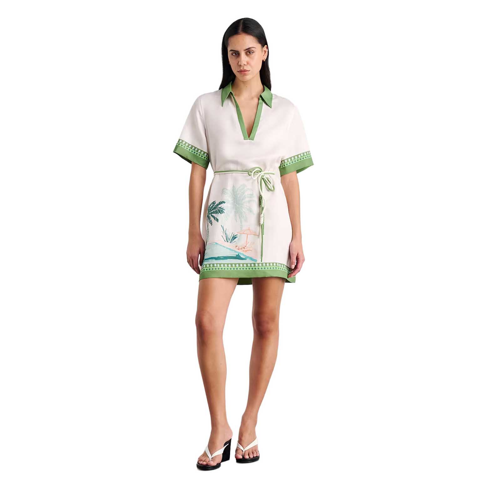 The Sunlounger Mini Dress features a mini length shirt dress silhouette. With a short sleeve, collared v-neckline and removable waist tie in a vibrant placement print. Style with a pair of strappy flats for a weekend ready ensemble.