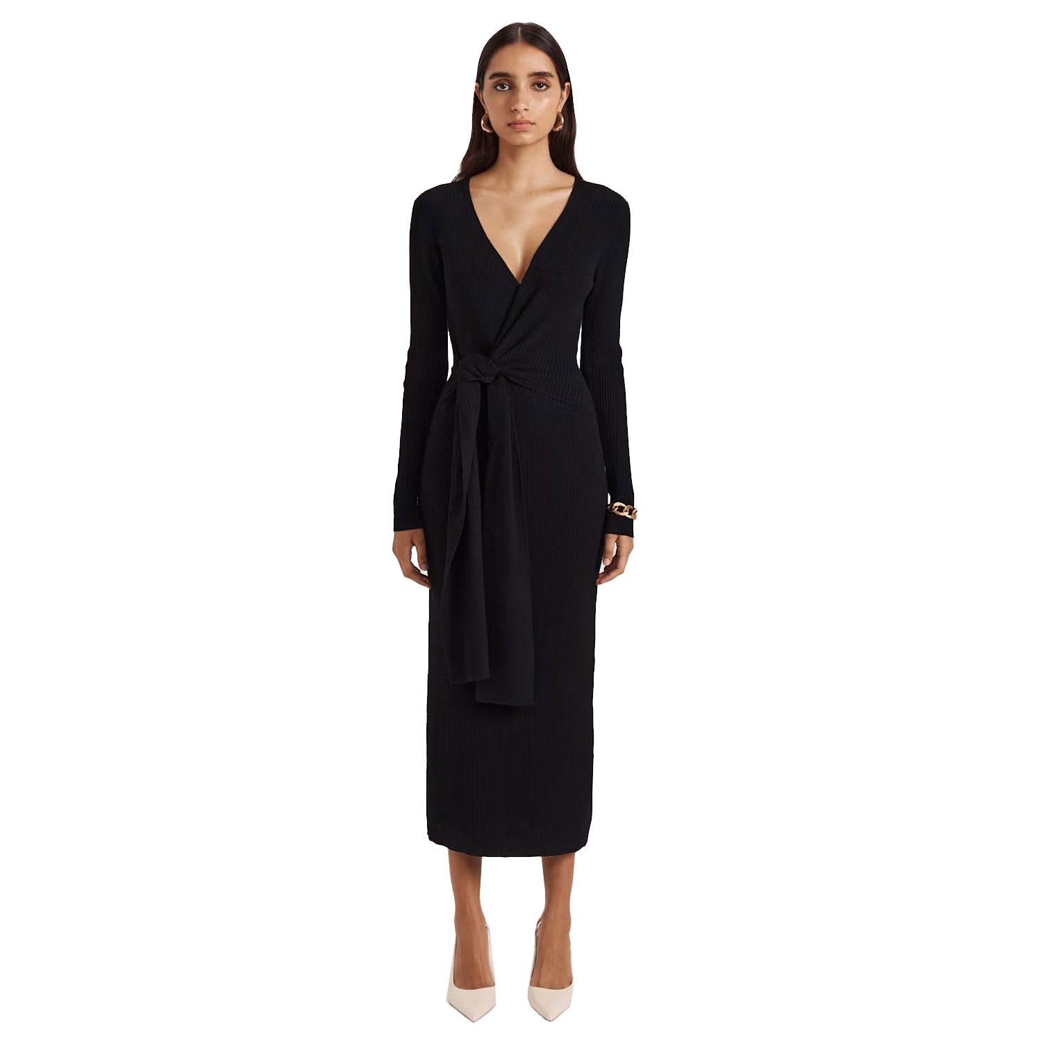 Crafted from Woolmark-certified merino wool, the Elle Wool Blend Wrap Knit Dress features a flattering A-line skirt and faux wrap design. The deep V-neckline and ribbed knit tie create a refined silhouette, making it a perfect choice for autumn layering with a structured coat and knee-high boots.