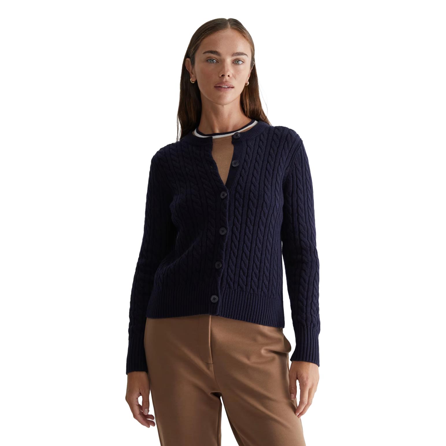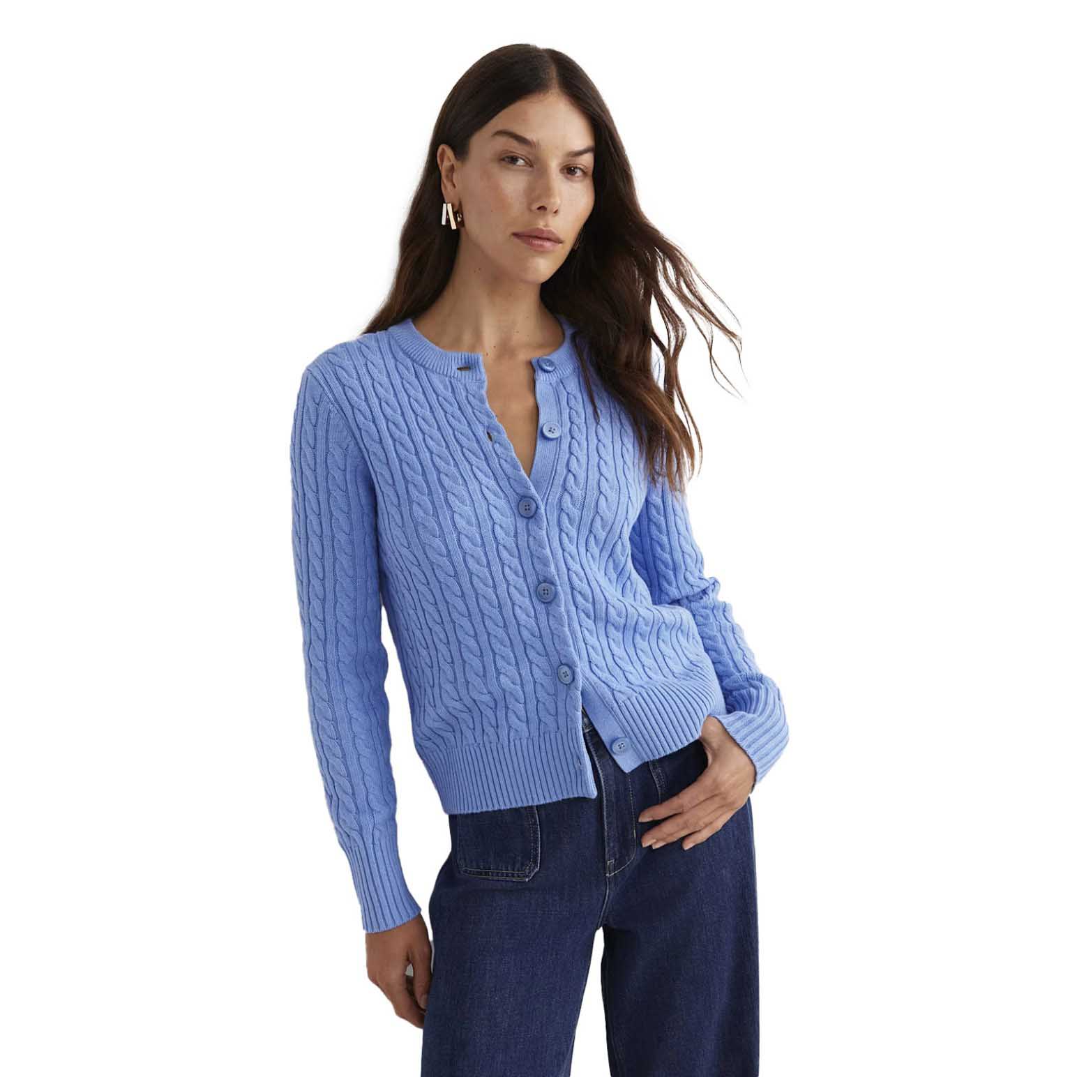 Refresh your daily outfitting with the help of the Cable Merino Cotton Cardigan. Made from merino wool and cotton blended yarn, this fully fashioned knit has an all-over baby cable knt design, button-through front fastenings, a crew neckline, ribbed trims and a regular fit silhouette. Wear it with a pair of wide leg jeans for an on-trend outfit.
