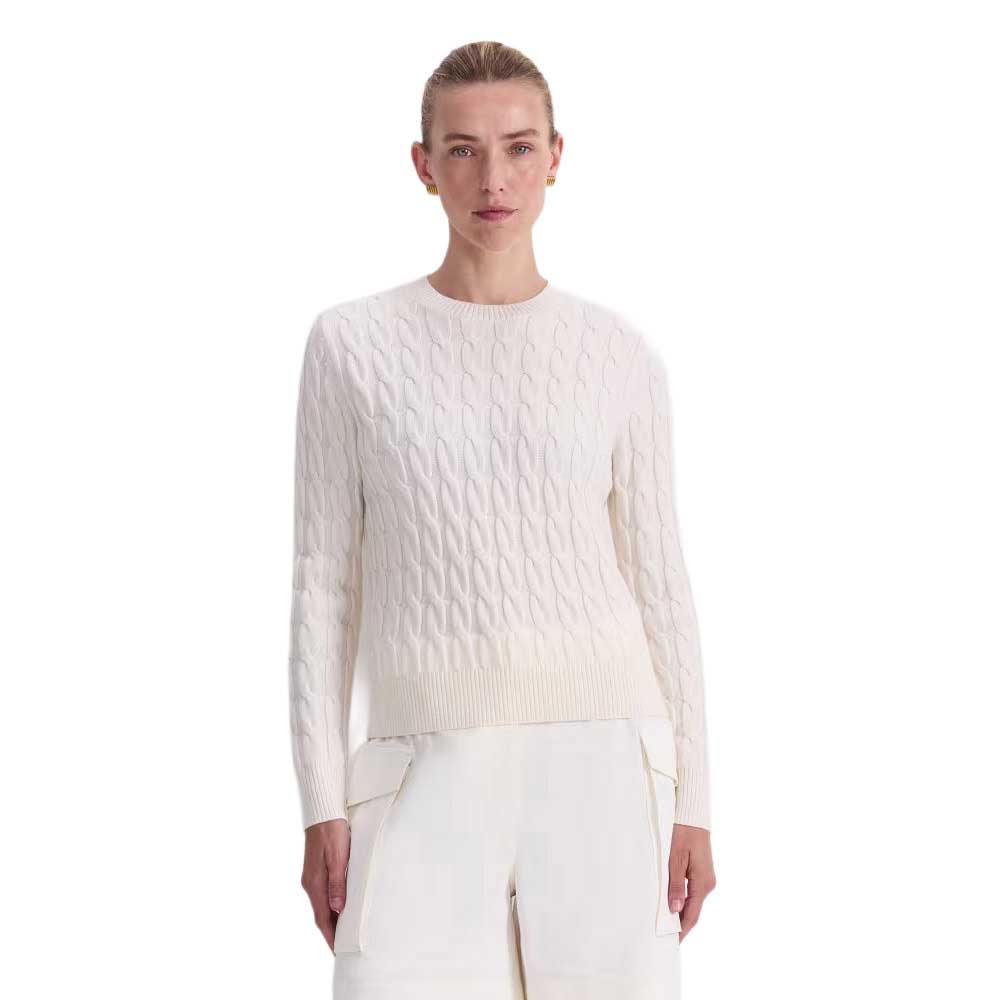 The Merino Cable Sweater is crafted from 100% extra fine Merino wool and Woolmark certified for quality and softness. This fully fashioned, regular-fit sweater features a classic cable knit, crew neckline, full-length sleeves, and ribbed trims for a refined finish. Style it with the Audrey Wide Leg Pant for a sophisticated layered look that carries from casual weekends to refined citywear.