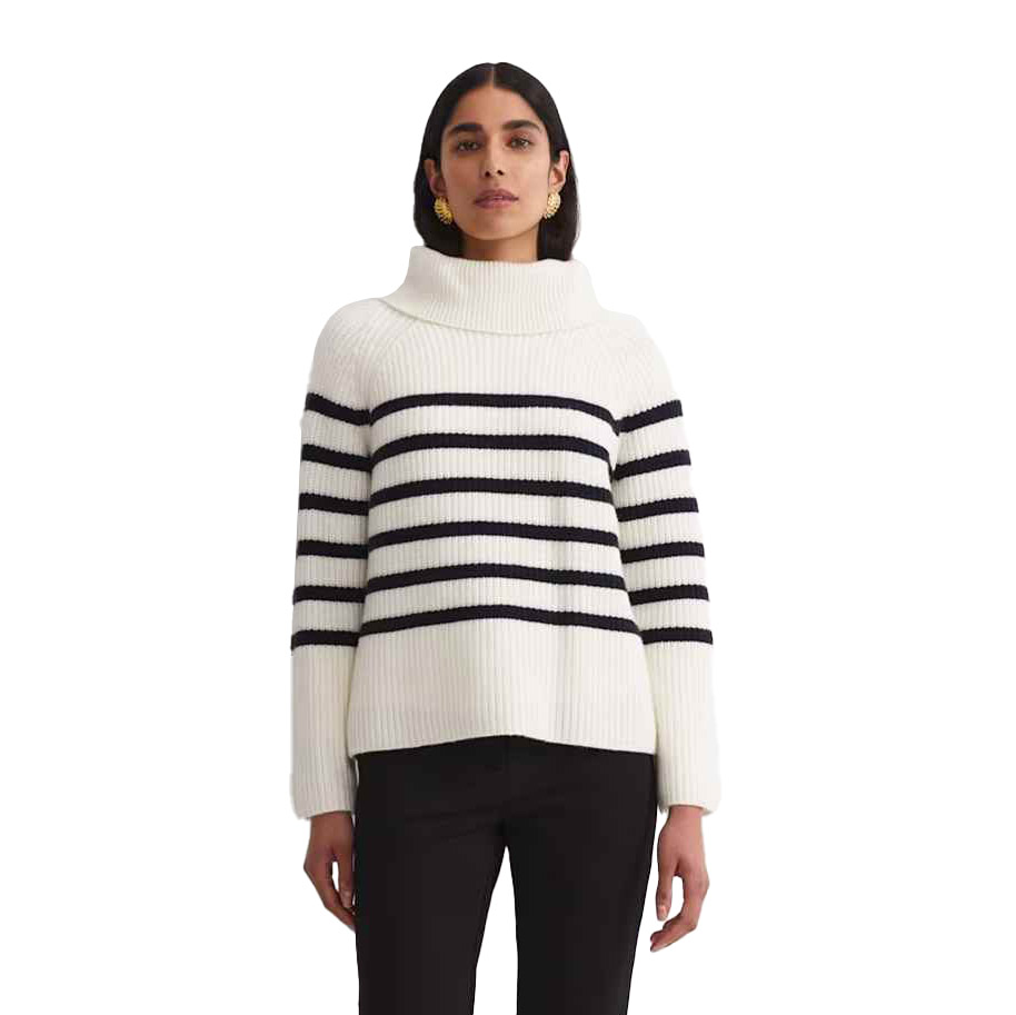 The Sunshine Stripe Turtleneck Sweater has been made from woolmark certified merino wool. This fully fashioned knit has a rolled neckline, long sleeves and a relaxed fit. Wear this top under a blazer for a modern workwear aesthetic.